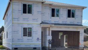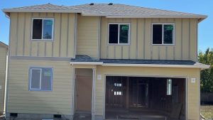 Installation of contrasting white panels and horizontal siding for the lower tier.